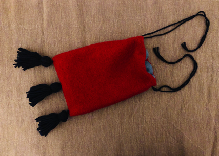 Almosenbeutel Der Almosenbeutel, wie der Name schon sagt, war für die kleinen oder grösseren Gaben an die Armen gedacht und beherbergte etwas Kleingeld oder andere Wertgegenstände. Selbstverständlich war auch der Almosenbeutel nicht nur zum aufbewahren der Almosen, sondern diente auch mit seiner Optik, je nach Träger, als Showobjekt und Statussymbol. Dieser Almosenbeutel wurde aus Wollstoff gefertigt und mit blauem Leinenstoff ausgefüttert. Die Kordel wurde aus geflochtenem Wollgarn hergestellt. Von der Ausstattung her war der Träger eher ein etwas besser gestellter Handwerker oder ein nicht all zu vermögender Kaufmann.