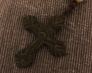 Paternoster Lateinisch für "Vater unser", eine Gebetsschnur mit der das genannte Gebet mehrmals am Tag durchgeführt wurde. Dies ist die kurze Form mit insgesamt 34 Perlen, die vor allem bei den Herren der Schöpfung beliebt war. Gefertigt aus unterschiedlich gefärbten Buchenholzperlen, mit einer Quaste aus Seidengarn und einem Bronzekreuz zum Abschluss. Das Bronzekreuz ist ein Original aus dem 13ten Jh. Der Paternoster war nicht nur Zeichen Religiöser Frömmigkeit, sondern auch ein Statussymbol, je vermögender der Träger, desto schöner und aufwändiger waren die Paternoster gefertigt. Neben Holz kamen noch viele weitere Materialien zum einsatz, zb. Bein, Glass, Koralle, Horn und sogar Silber.